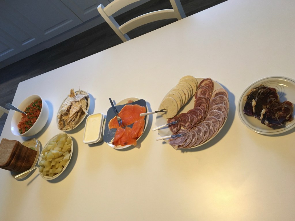 After the hike, I returned to Funningur for supper and time with my friend, Alis. Then back to a quiet house just down the street–wondering what was in store the next day. The light dinner in the evening or late afternoon is call “bread.” It often consists of a delicious and heavy bread, fish sausage, sliced lamb, dried fish (like jerky), smoked salmon, cooked vegetables/potatoes and butter.