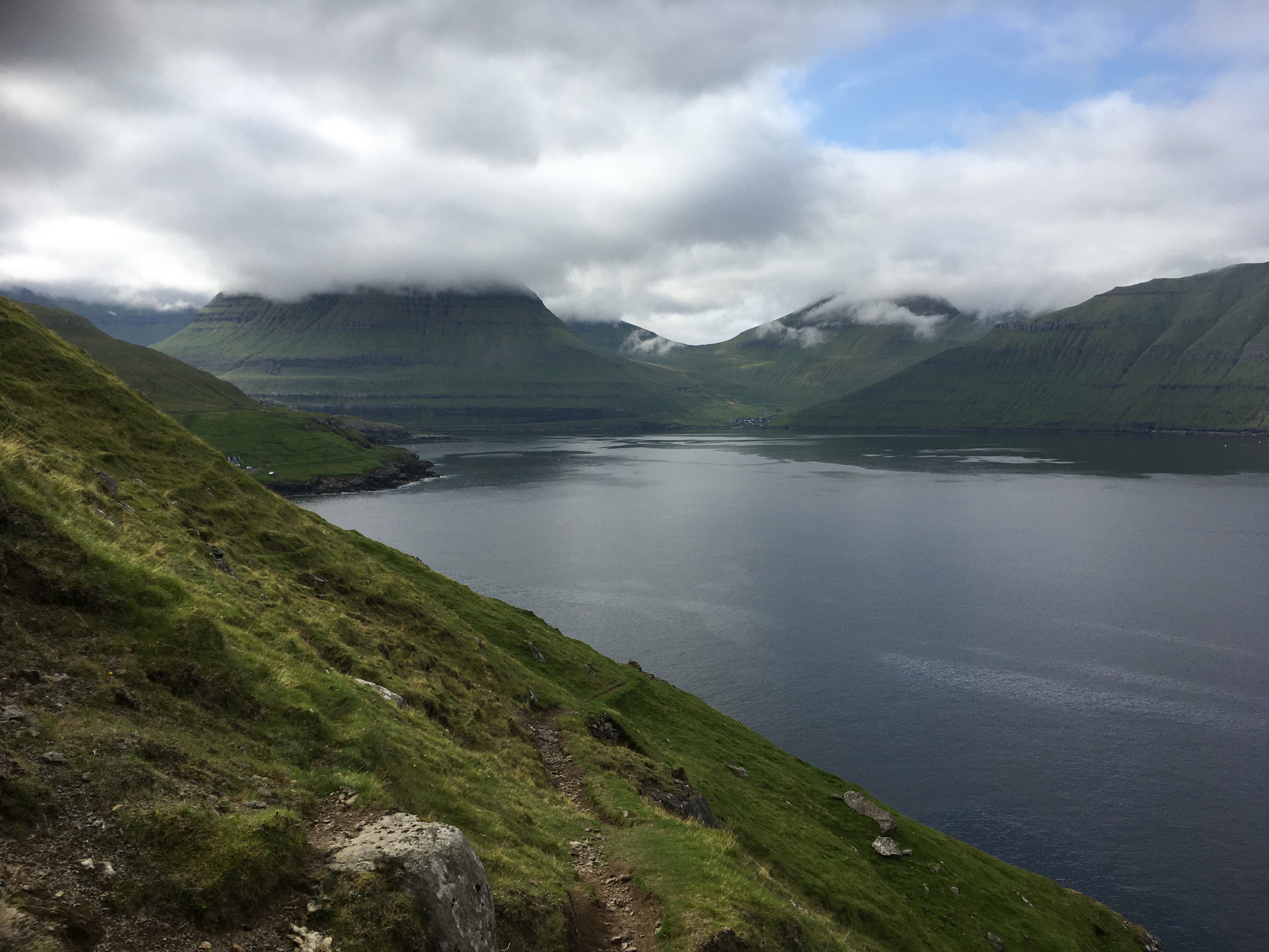 Mary went home on Friday and I miss her company. But being alone gives me such a neat feeling of “total immersion” in this culture and certainly doesn’t stop me from exploring a bit. My first little hike was near Elduvík, across the fjord from Funningur. In fact, I could see my house from the trailhead, just outside of the village.