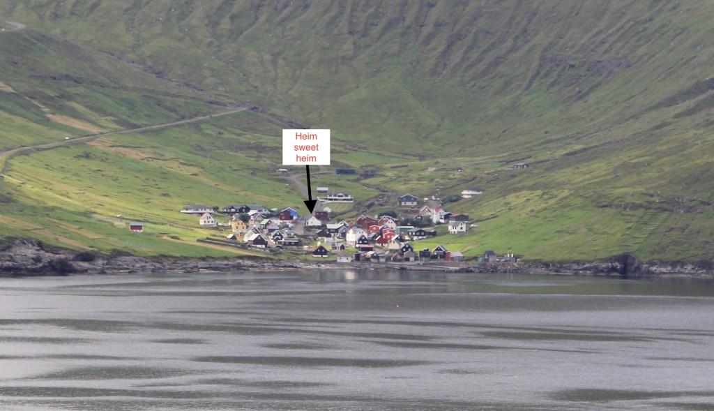 I found one thing to be so strange in the Faroes. Salmon farming is one of the major industries here, but to find fresh salmon to bake is not easy at all. That was my mission, so I headed to Leirvik, home of the NordFra fishing industry. Of course, they were closed on the weekend, but I manage to find two small packages of “bakkafrost” in the freezer at the Effo station. I had found my salmon and they were almost $10 each! But I snatched them up and will have that for dinner tonight. Sasi and Alis and family turn their noses up at anything but the traditional thin-sliced, smoked salmon (lox). I’m hoping they will taste mine and like it, but I’m not holding my breath. More for me, if they don’t like it. And, by the way, it’s the best salmon I have ever tasted–fresh from the fjordal fish farms you see everywhere in this country. Lip-smacking and finger-licking good!