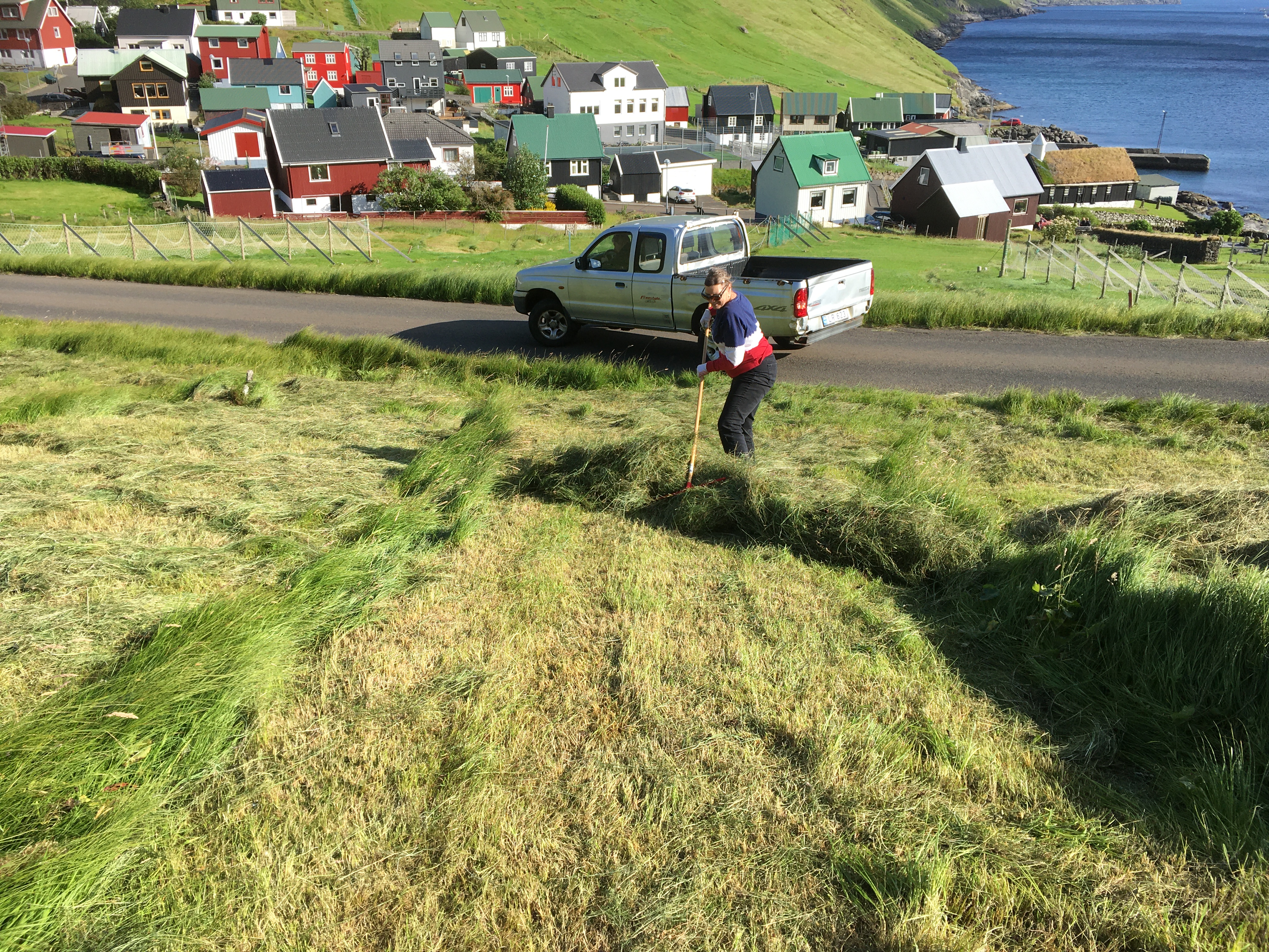 Salmon for breakfast, haddock for supper and a hard day’s work in the hay fields in between. Actually, it wasn’t that hard. Martin and his friend, Haldor, began work at 10AM. I joined them around 10:30AM and raked the grass down the hill to the road. That way it would be easier to load onto the truck. After a couple of loads, the men took me to another field in back of the village and I was to turn the grass to allow it to dry a bit more. I’m guessing that batch of hay will be collected next week, even though it might be raining all week. I worked hard until about 1:30PM.