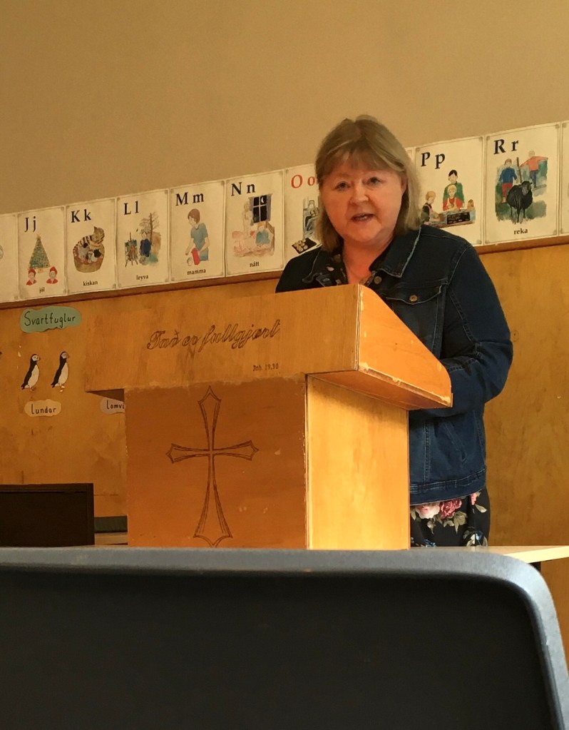 Today is Sunday and I look forward to going to the 11 a.m. service in the small, sod-roof church down by the Funningur harbor. Last night I was with Alis at a Christian Bible Conference, hosted at the denominational headquarters. The speaker talked about how God leads us–Hvussu lei∂ur Gud? Although I understood only 5% (maybe!), it was good to be with brothers & sisters in Christ. The most amazing thing to me is that God understands Faroese–a challenging language with roots in old Norse, what the Vikings spoke! I bought a children’s Bible storybook, hoping it will help me learn a little bit more of the language, especially when I have Alis record each of the stories and I can practice the pronunciation. At least, that’s the plan.
