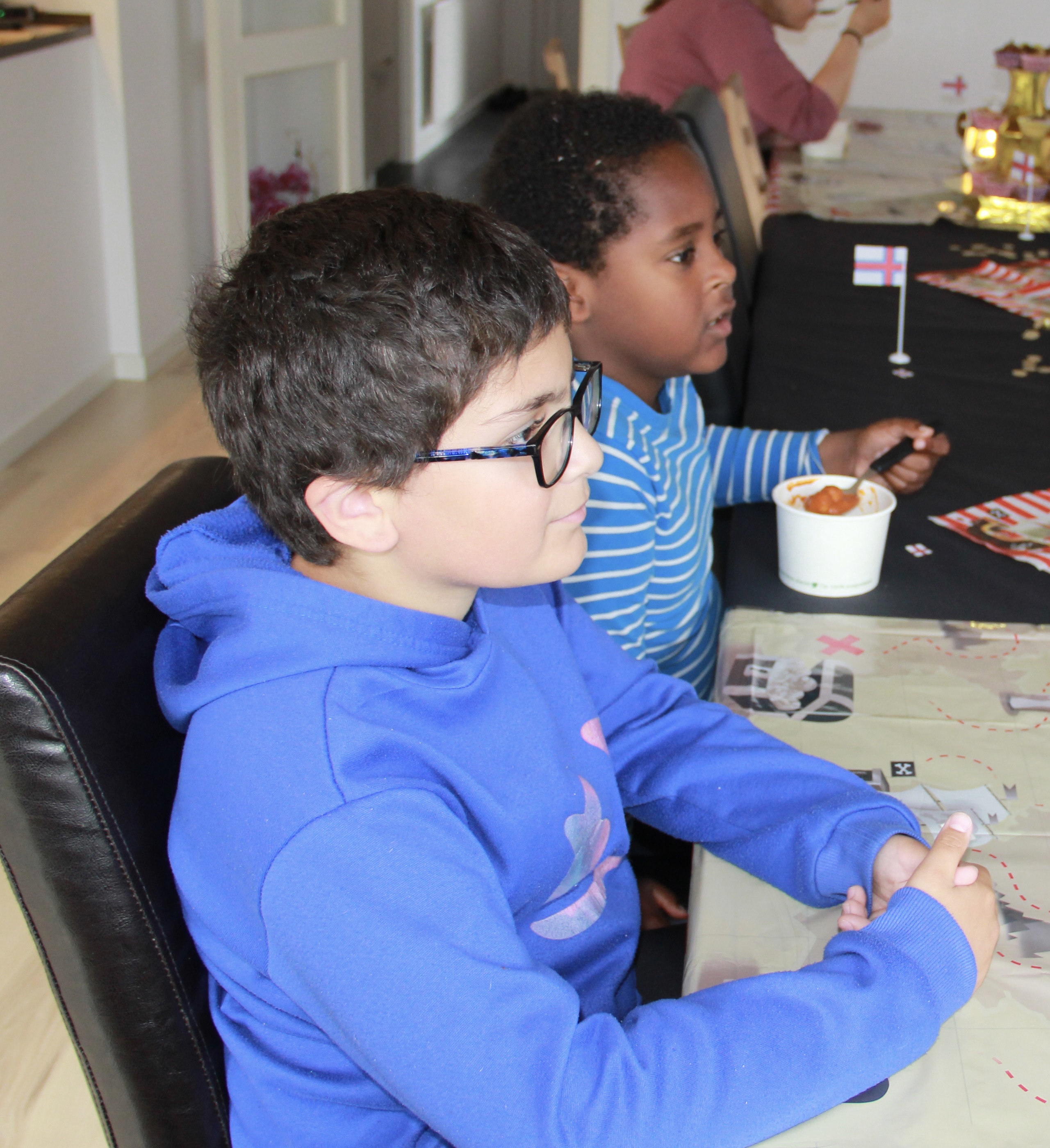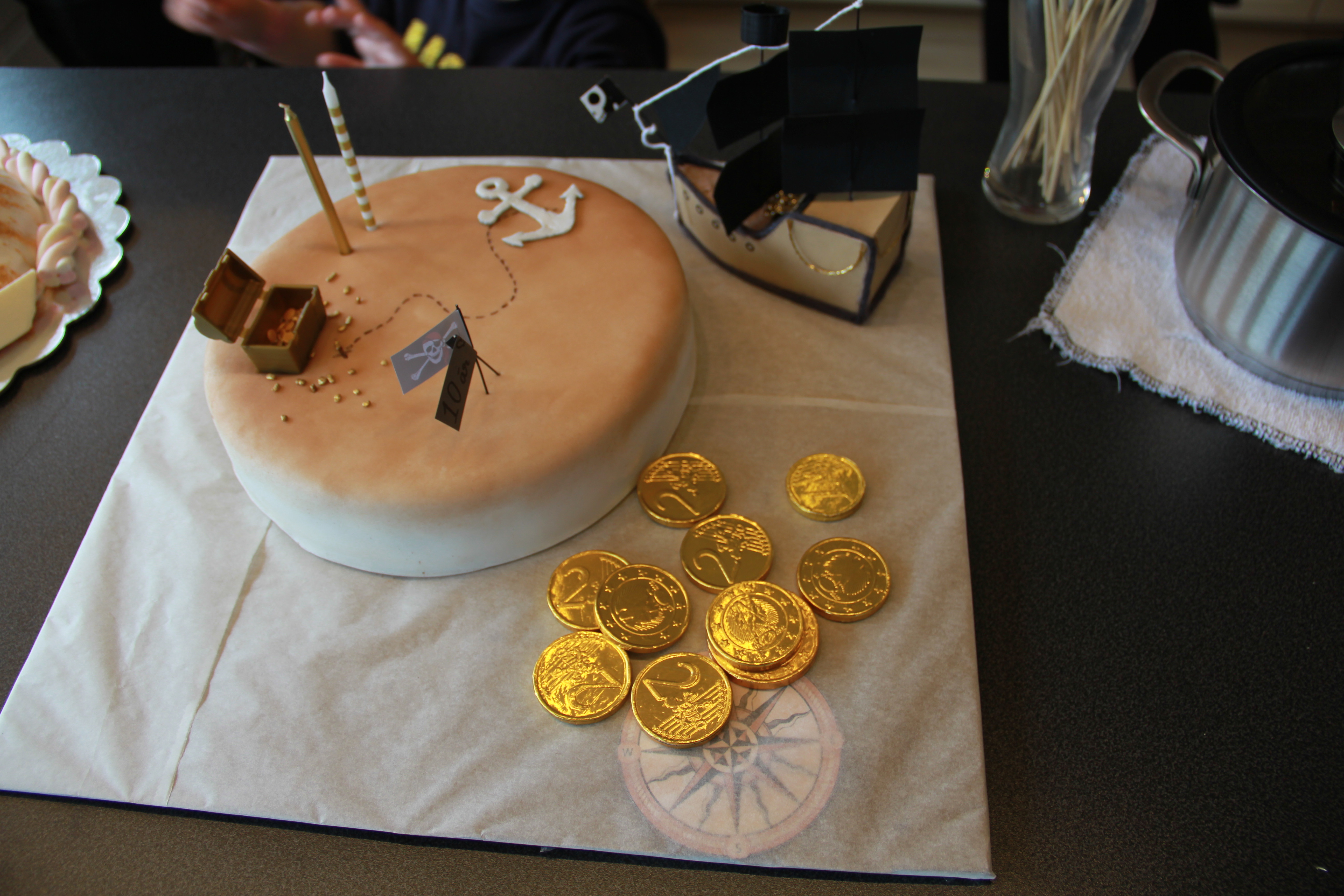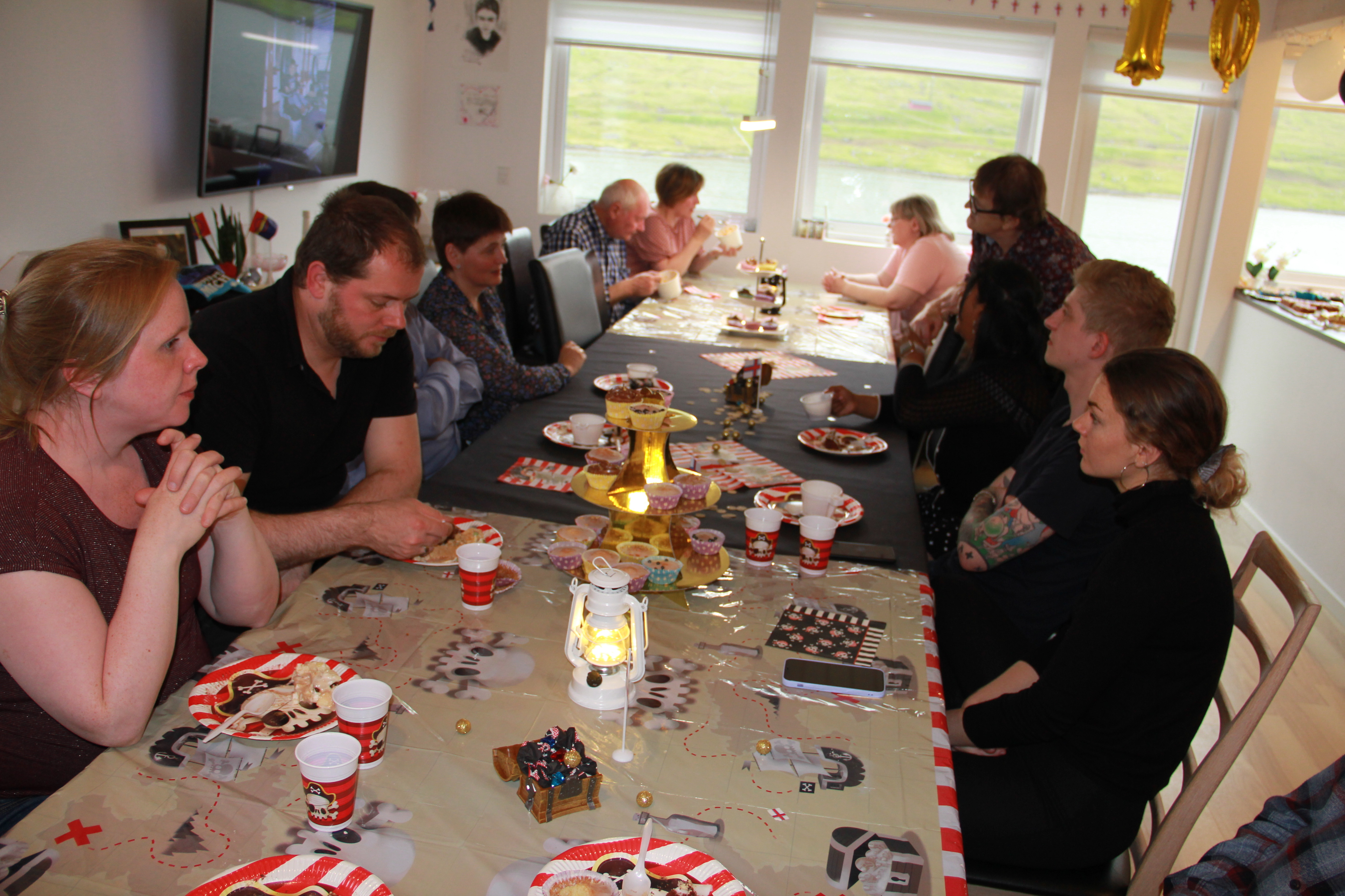 I slept well and when I awoke, Sasi was just returning (at 10AM) from her substitute teaching job. We had brunch (bread, brie, smoked salmon, sausage and coffee). Then the final prep began. She had already set the table with a “Pirates of the Caribbean” theme. Alis made four cakes, Sasi made a cake and her in-laws made cakes. Lots of sugar–and such yummy cakes (mostly meringue based). My soup lentil soup was not a hit, but some tried it and were polite. Family and friends began to trickle in around 4PM. Gudmar hoped to buy an iPad, so mostly people brought cards & money. He had one friend, Bjetni, come to his party. In the Faroes, the birthdays ending with “0” are the big ones and celebrated with great fanfare. That’s why Gudmar’s 10th birthday was BIG!